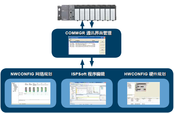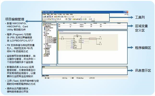 整合運動控制編輯:ISPSoft V3將邏輯編程與運動編程整合在同一套軟件上,并提供符合國際標(biāo)準(zhǔn)規(guī)格 PLCopen? 的功能塊以及臺達提供的豐富功能塊